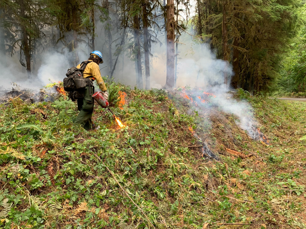 In addition to firing operations, crews are limbing and thinning trees and improving old logging roads. This work will create a fuel break and reduce ladder fuels. Ladder fuels refer to smaller trees and the lower limbs of trees, lichen, moss, and shrubs. Removing these ladder fuels reduces the chance of fire climbing into the canopies of the larger trees.