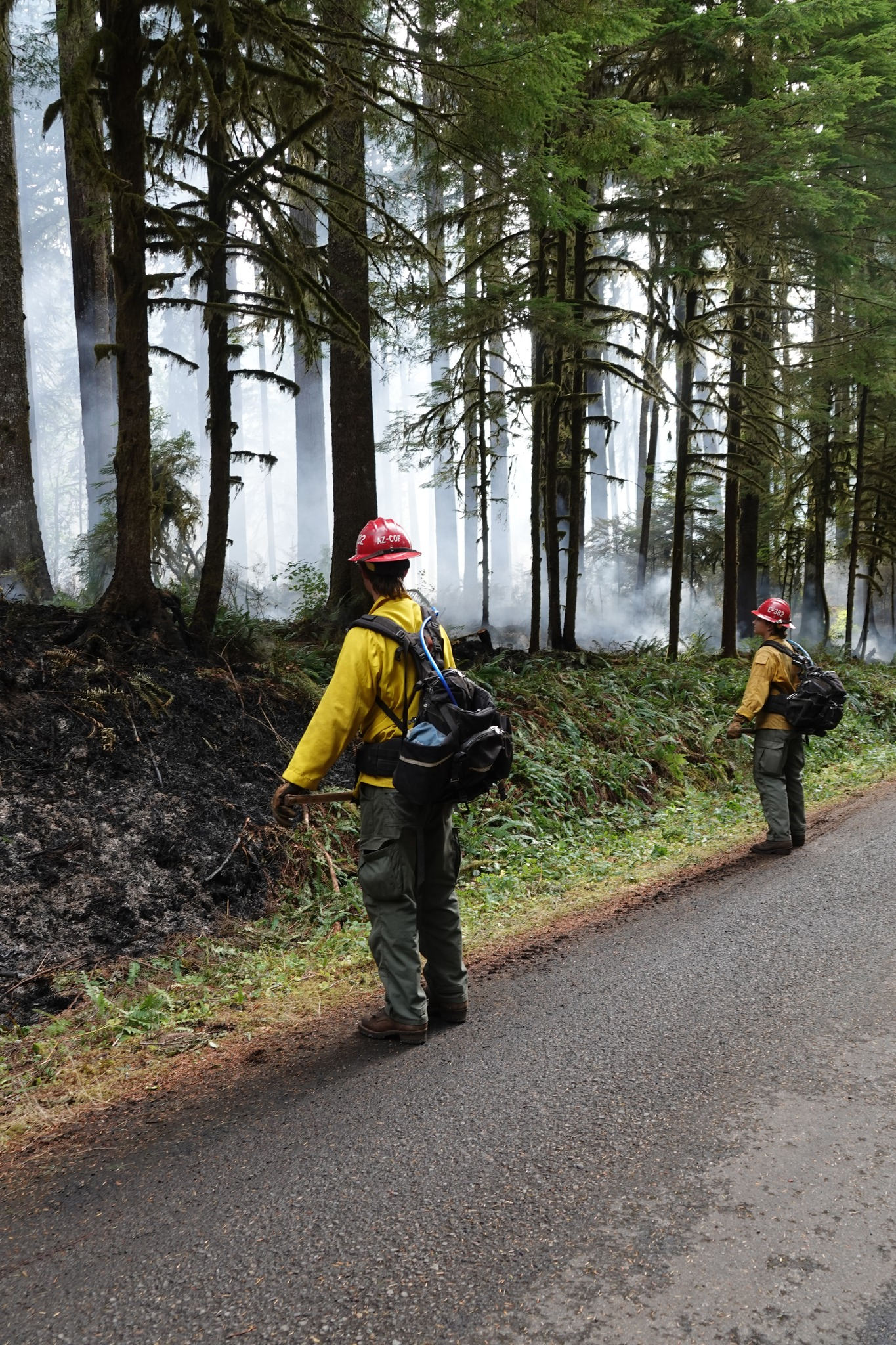 In addition to firing operations, crews are limbing and thinning trees and improving old logging roads. This work will create a fuel break and reduce ladder fuels. Ladder fuels refer to smaller trees and the lower limbs of trees, lichen, moss, and shrubs. Removing these ladder fuels reduces the chance of fire climbing into the canopies of the larger trees.