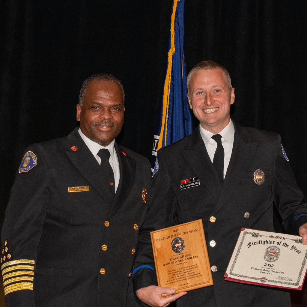 On October 5, 2023, Seattle Firefighter Aaron McCandless was named, 2023 Seattle Firefighter of the Year by the Seattle Fire Department during their October Annual Seattle Fire Award Ceremony.