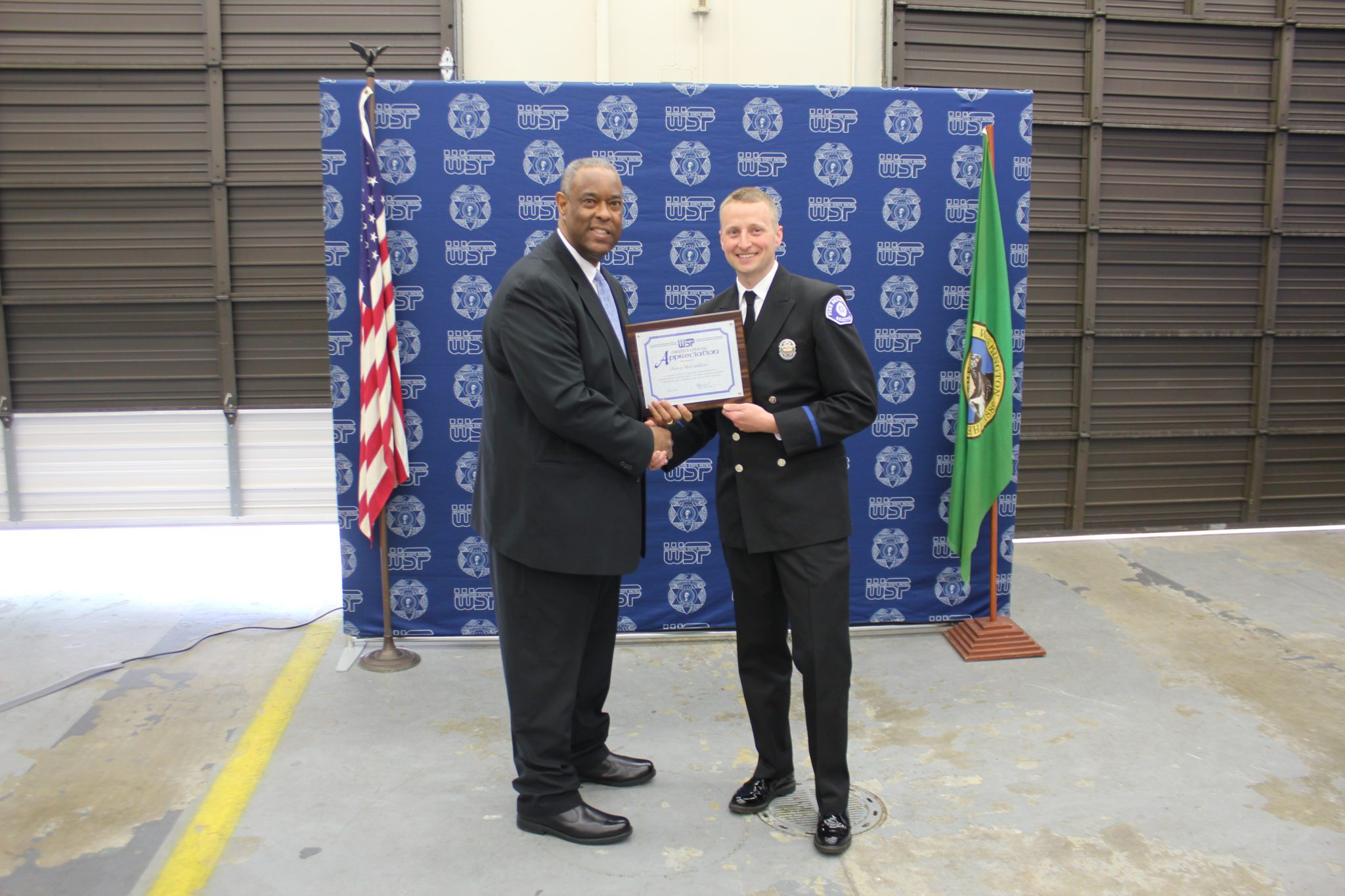 Photo Description: Firefighter McCandless (R) with WSP Chief John Baptiste (L).