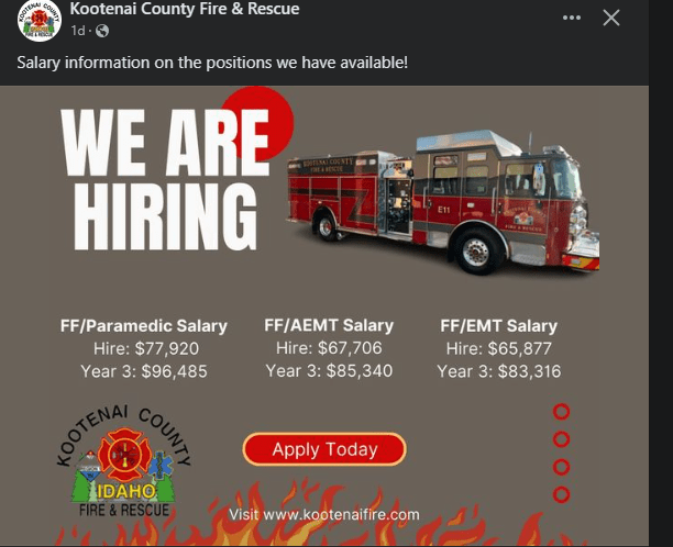 Go to the Fire District’s website: http://www.kootenaifire.com and apply. There are 16 positions opened and this is for the first half of 2024, so this is the best time to become one of their members. Don’t wait to long as this announcement closes on November 6, 2023.