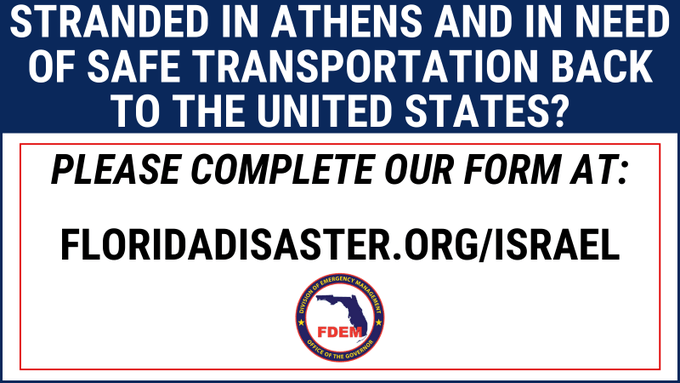 OCTOBER 15, 2023 — The Florida Division of Emergency Management has sent out a message to those who are seeking safe transportation back to the United States from Israel, which the State Disaster Agency says may be able to help travelers.
