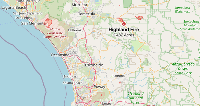 The Highland Fire which is located about 19 miles southeast of Temecula and the fire’s origin on the Highland and Aguanga Ranchos Roads, Aguanga(Riverside), California remains with minimal fire behavior and smoldering.