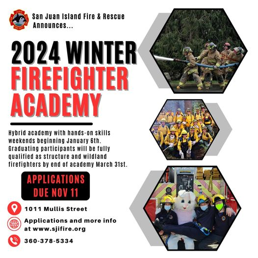 Save the Date: The 2024 Winter Firefighter Academy will be hosted by the San Juan Island Fire & Rescue agency. Applications are due no later than November 11, 2023. Details: http://www.sjifire.org.