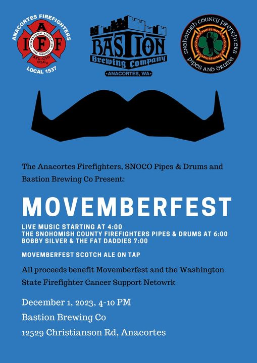 The Anacortes (WA) Firefighters, SNOCO (Snohomish County) Pipes & Drums and the Bastion Brewing Company are hosting the 2023 Movemberfest event on December 1, 2023, at 1600-2200 hours at the Bastion Brewing Company venue located at 12529 Christianson Road in Anacortes, Washington. All Proceeds benefit the Movemberfest and the Washington State Firefighter Cancer Support Network.