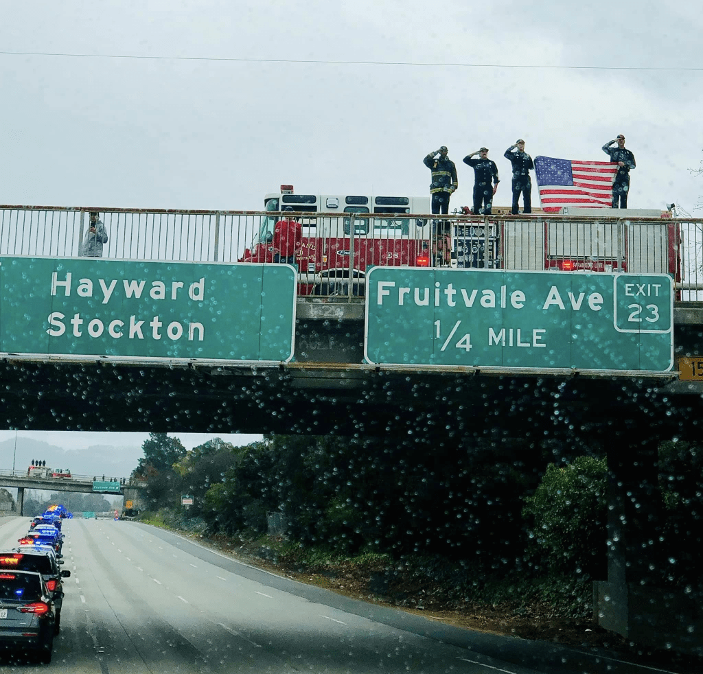 (Below) Oakland Firefighters line to overpasses and roadways to honor the life of Officer Le by showing their respect. The image tells it in a million words. Photo Credit: OFF IAFF Local 55