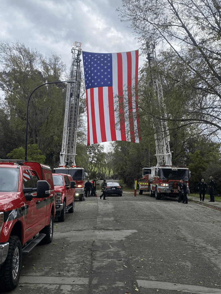 (Below) Oakland Aerial units fly a flag in honor of the life of Officer Le by showing their respect. The image tells it in a million words, like the one above. Photo Credit: OFF IAFF Local 55
