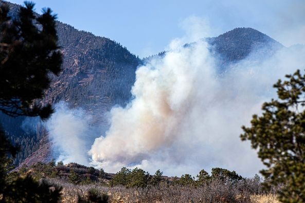 A brush fire ignited from an unknown cause around 1300 hours MST (1200 hours PST) west of the Pine West Housing area and on the eastern border of Pikes National Forest. This prompted an immediate response of two divisions from the U.S. Air Force Academy and Colorado Springs Fire Departments.