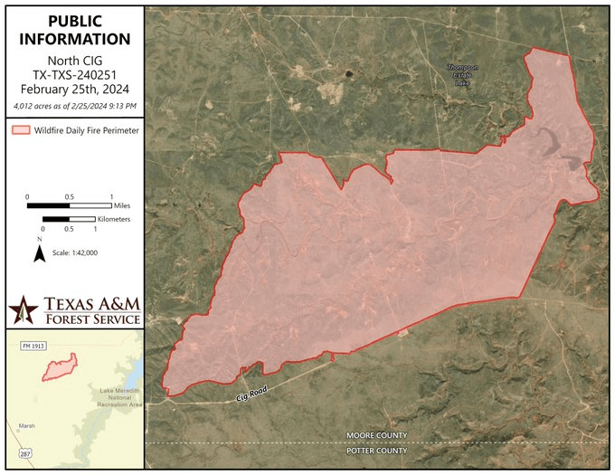 The North Cig Fire ignited on February 24, 2024, but the following day, the wildfire burned up to 4,012 acres and became 100% contained. All of the State resources had been released and the fire was transitioned back to the local unit. This is located in Moore County, Texas.