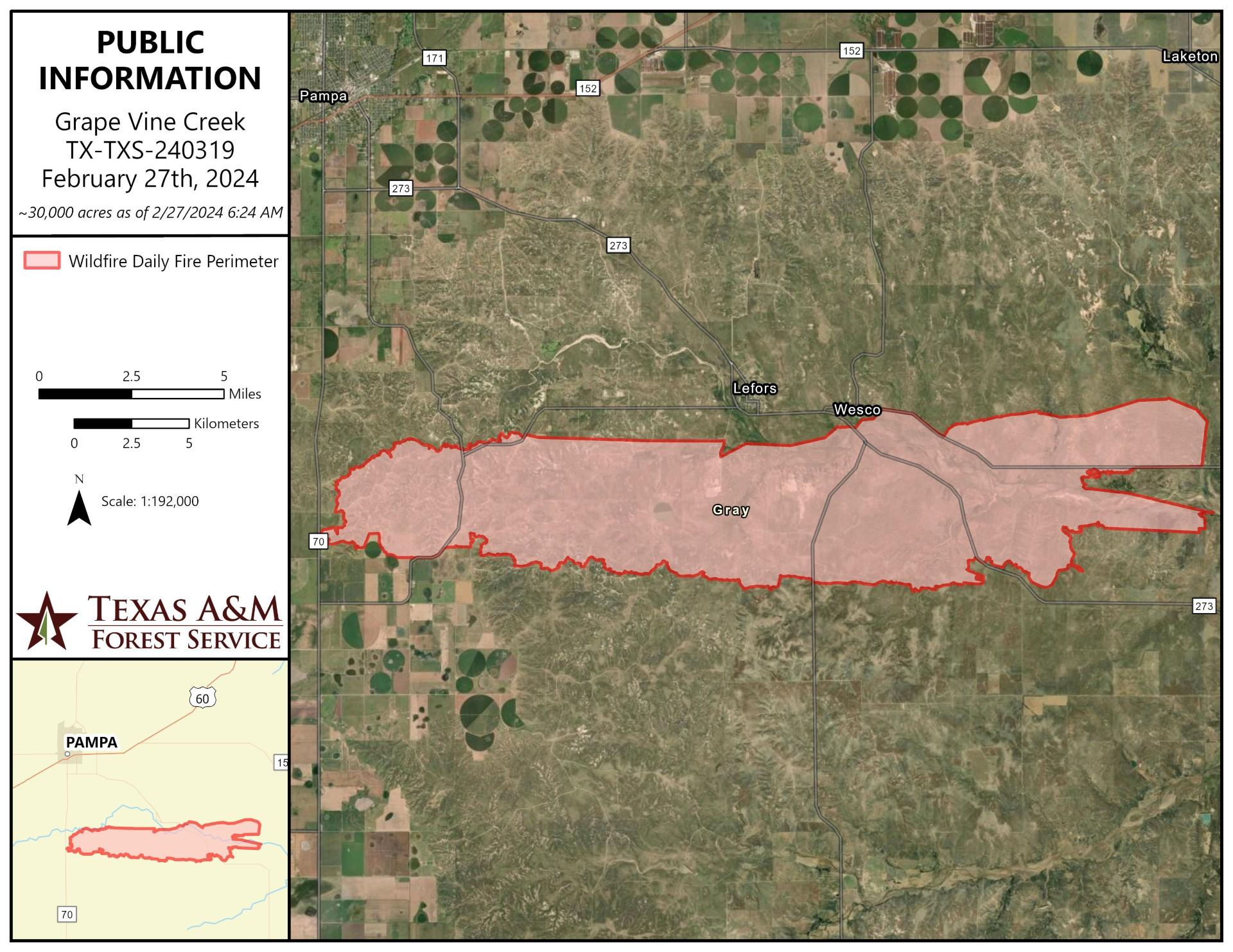 A wildfire named the Grape Vine Creek Fire, broke out on Monday, February 26, 2024, at 1510 hours CST. The fire was originally reported as nine-and-a-half miles southwest of Lefors (Gray County), Texas, along with Hwy283. However, on Wednesday it extended further into heavy fire fuels and about three miles southwest of the town and approximately listed as 10 miles southeast of Pampa.