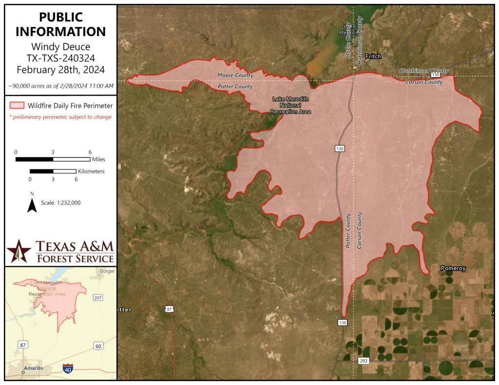 “As Texas Agriculture Commissioner, I am deeply concerned about the devastating wildfires raging through the Texas Panhandle. These fires not only threaten lives and property but also have a significant impact on our agriculture industry. We stand in solidarity with our farmers and ranchers facing loss and destruction. Our thoughts are with them during this challenging time, and we’re committed to supporting their recovery efforts every step of the way.” – TX Dept. of Ag. Commissioner Sid Miller | Photo Credit