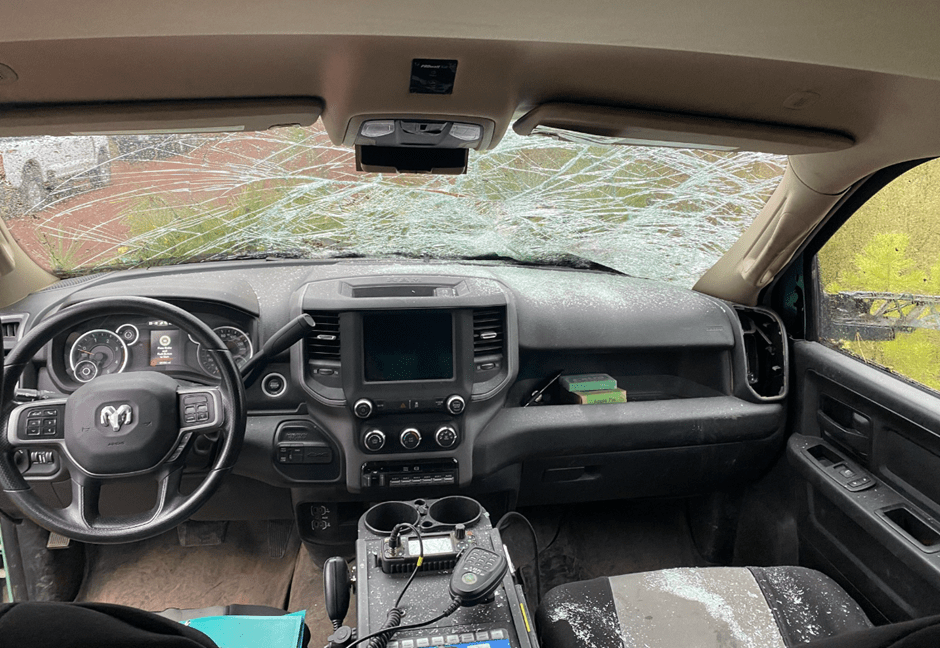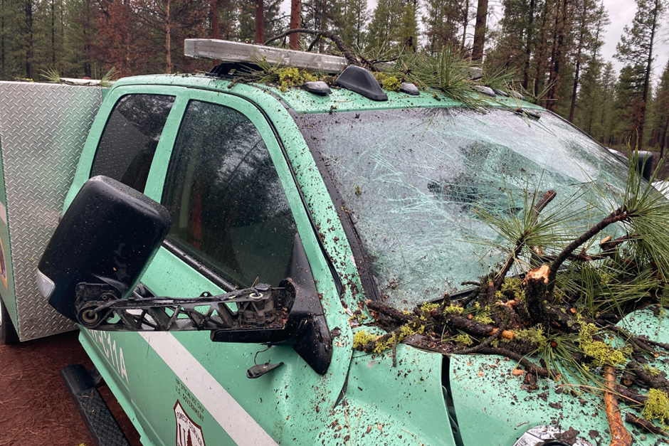 On May 4th, a rotten tree fell onto a fire service vehicle which was leaving an early morning debriefing area near Klamath Marsh to the fire line. The large tree shattered the front windshield and caused extensive damage.