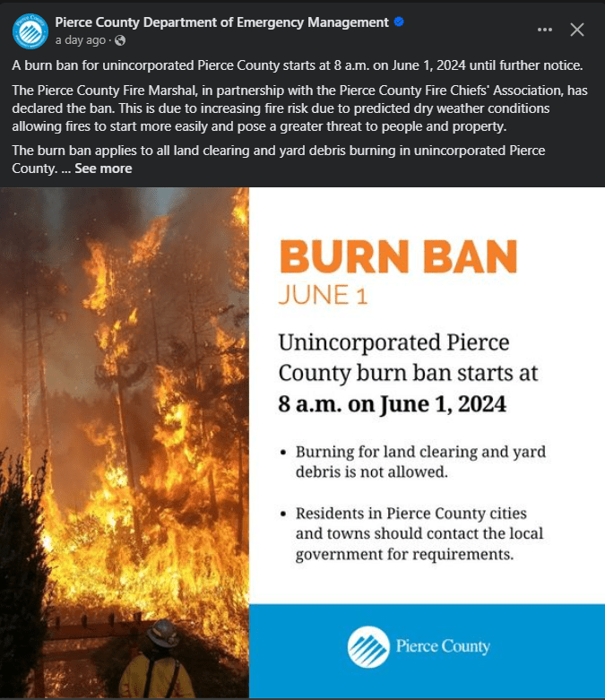 PIERCE COUNTY, WASHINGTON — An unincorporated county will begin a Burn Ban beginning on June 1, 2024. This is in response to the 2023 wildfire season and they are trying to be proactive, not reactive should fires begin to ignite within the County.