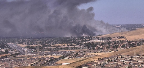 A large smoke column can be seen from one of ALERTCalifornia’s fire cams (Evora Road) with structures in the foreground.