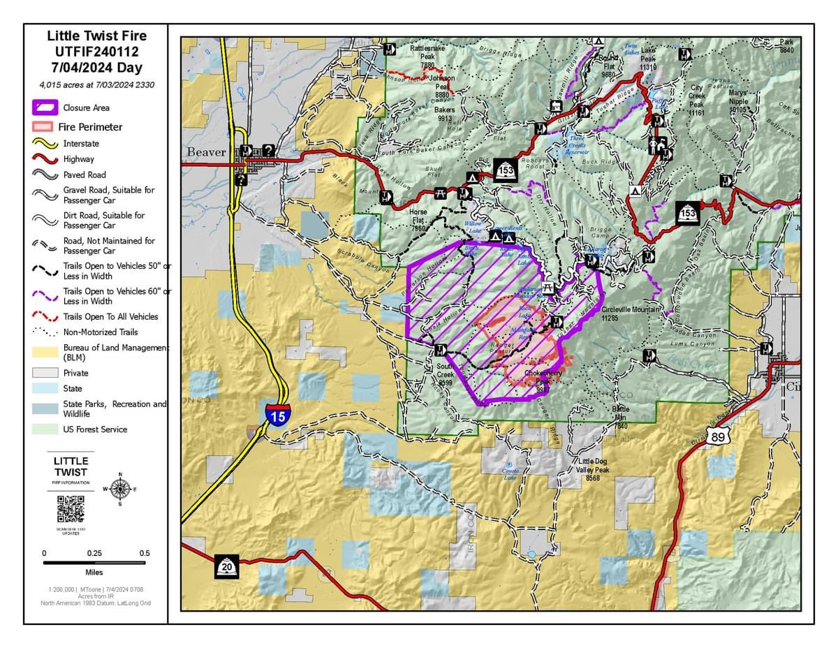 The LITTLE TWIST FIRE is burning four (4) miles southeast of Beaver, Utah, and is under the management of the U.S. Forest Service – Fishlake National Forest.
