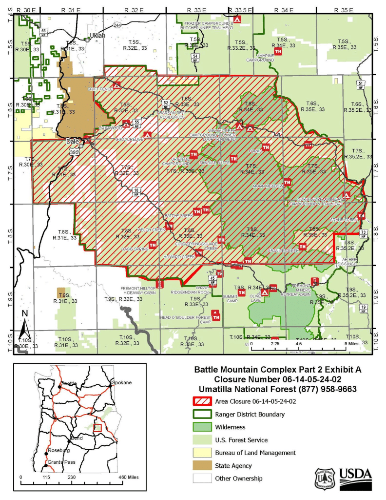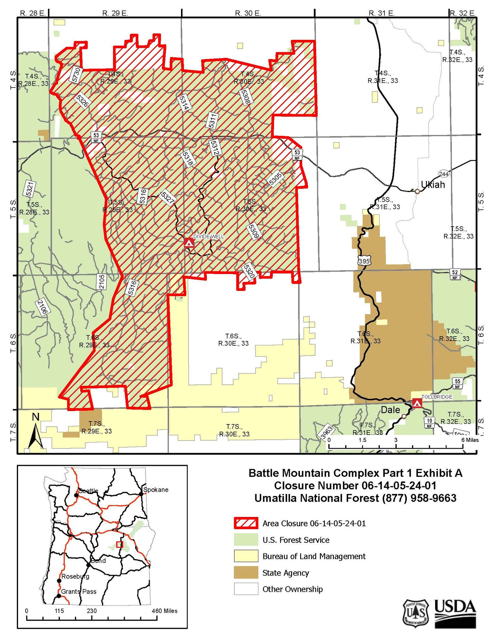 U.S. Forest Service officials are temporarily closing some of the lands, trails, and roads in North Fork John Day Ranger District to ensure safety for the public and firefighters engaged in operations to suppress the Battle Mountain Complex, Upper Winom, Double Snag, Big Creek, and Monkey Creek Fires.