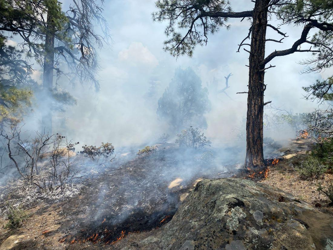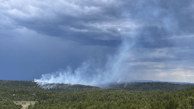 The Mestenas Canyon Fire is burning two miles north of Hwy 64 and about 10 miles southwest of Dulce, New Mexico (USA) in the Jicarilla Ranger District on the Carson National Forest.
