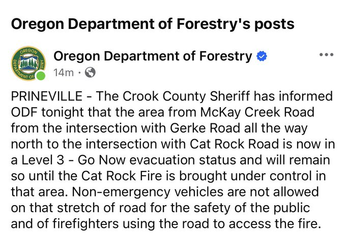 Incident Cooperators include the ODF – Prineville District, the Crook County Sheriff, the U.S. Forest Service, BLM, Crook County Fire & Rescue, and the Crook County Sheriff’s Office.