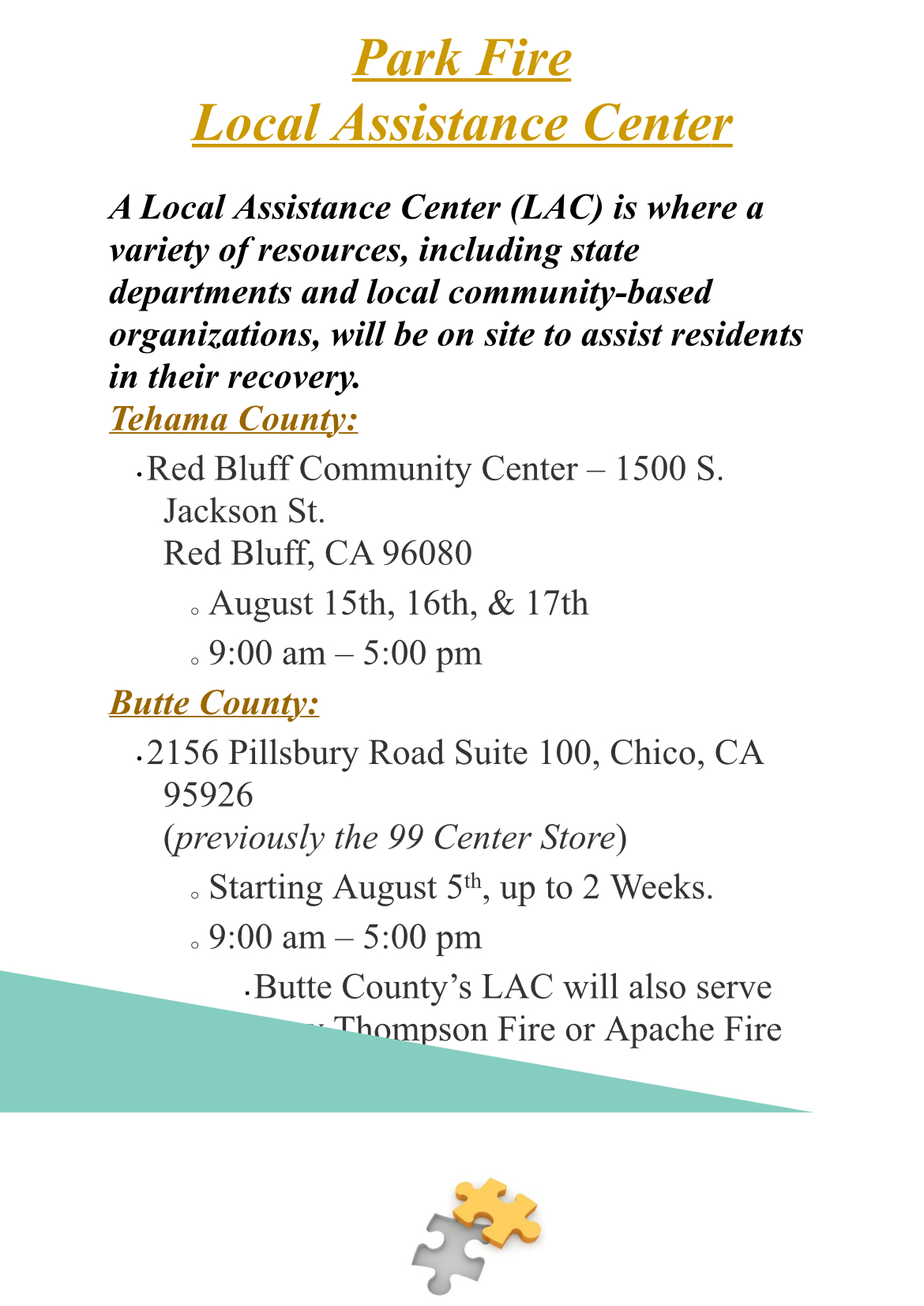The Butte County Sheriff’s Office is lifting the Evacuation Warnings for Zones 299, 283A, 282, 281, 271, 269, 268, 267, 266, 265, 264, 263, 246, 245, and 241B. For more information, including a map of the area, please visit www.buttecounty.net/sheriff or call (833) 512-5378. (8/3/2024 1500 hours PT)