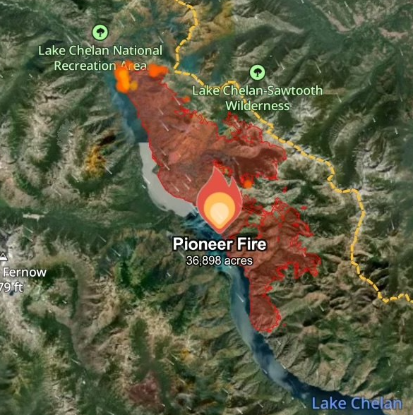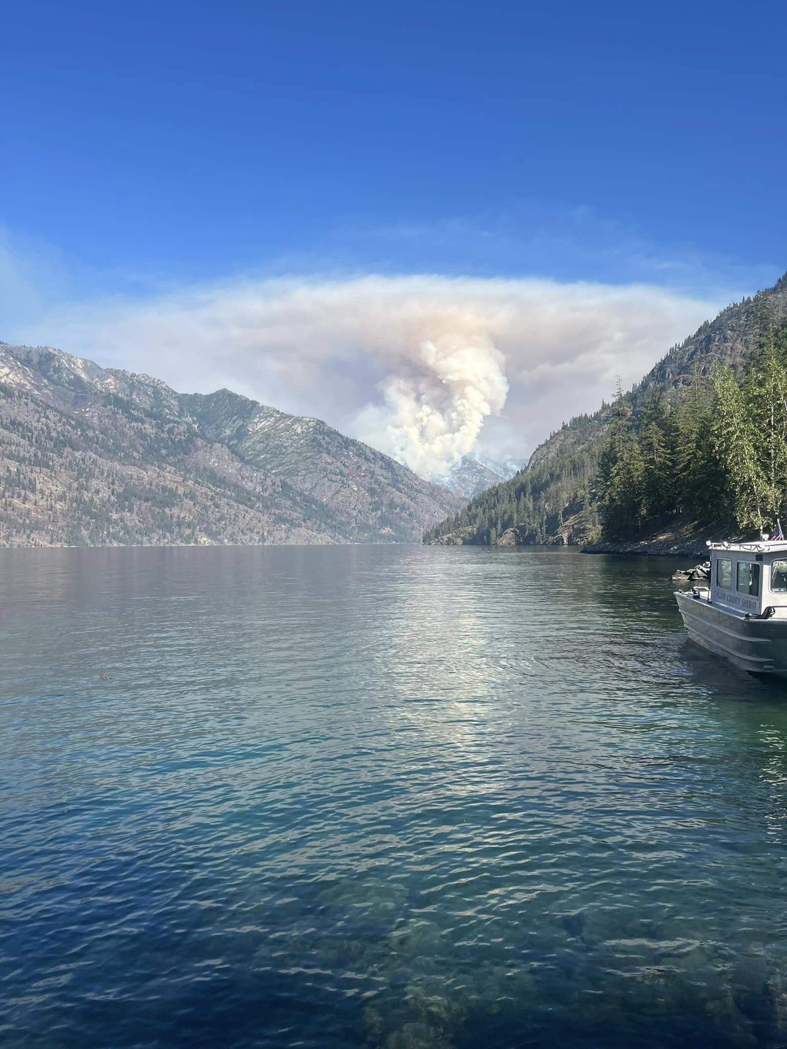 According to Fire Officials, the fire has moved to the south side of Boulder Creek, progressing northeasterly and firmly entrenched in the 2010 Rainbow Bridge burn scar between Little Boulder Creek to the south and Rainbow Creek to the north. Crews will continue improving handlines around the area to prevent the fire from moving deeper into the community of Stehekin.