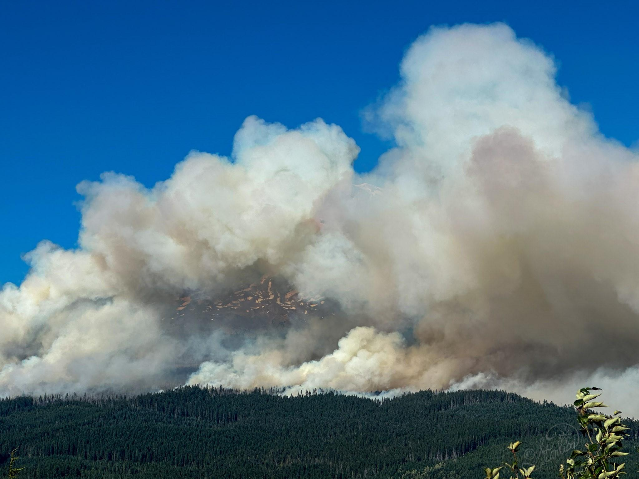 Yesterday, due to intense winds, spot fires were established approximately one mile ahead of the main body of fire on the eastern flank. The fire is expected to move upslope towards Mt. Adams, through the previous burn scar.”