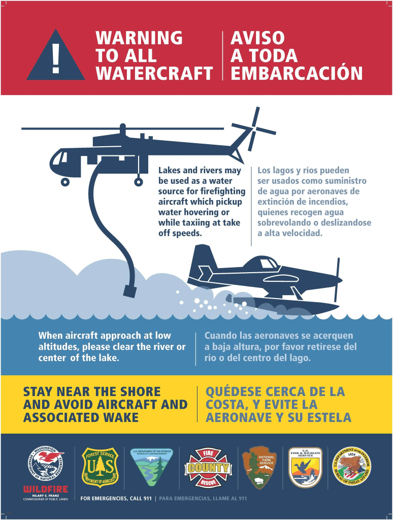 Warning to All Watercraft: Fire Suppression aircraft and helicopters are dipping out of nearby Lake Cushman and Fire Officials are asking those on the water to steer clear of them, for yours and their safety while they are drafting water from the lake.