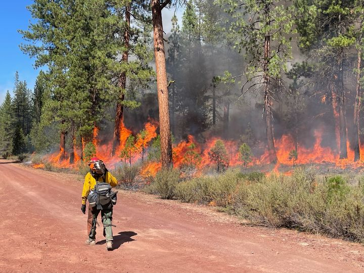 Photo Description: A Firefighter patrols the line during a burnout operation along the northern flank of the Flat Top Fire on Saturday, September 14, 2024.