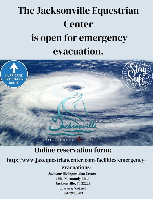 Evacuation Shelter: Jacksonville Equestrian Center: Online reservation form: http://www.jaxequestriancenter.com/facilities/emergency . 13611 Normandy Blvd, Jacksonville, FL 32221. Phone #: 904-790-0303. They have stalls and full hook-up RV sites.