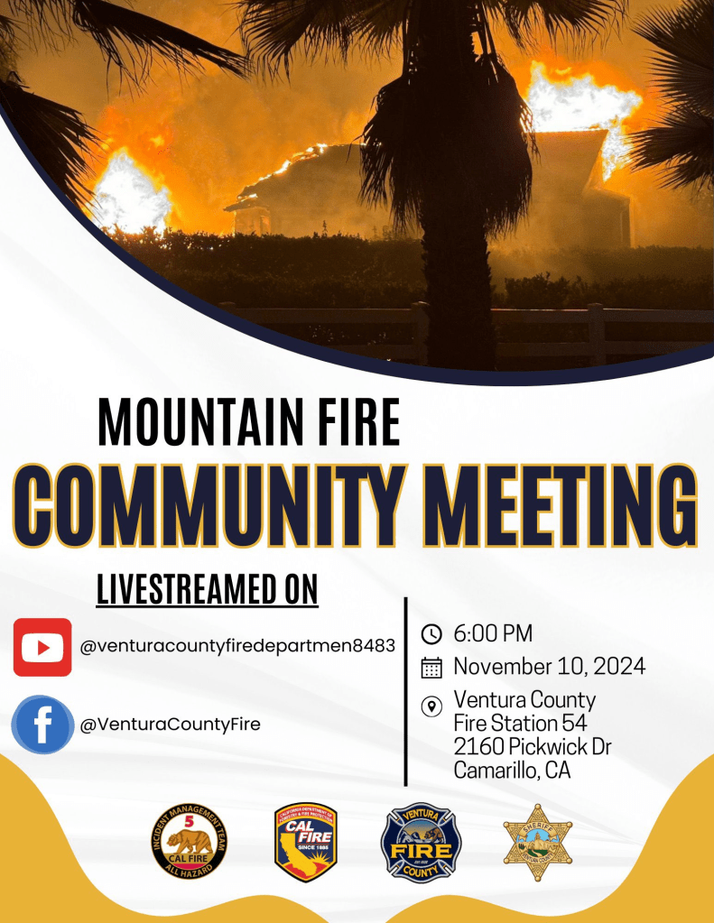 The MOUNTAIN FIRE Incident Management Team will be hosting a community meeting at 6pm Sun at: Ventura County Fire Station 54 located at 2160 Pickwick Drive in Camarillo, California.