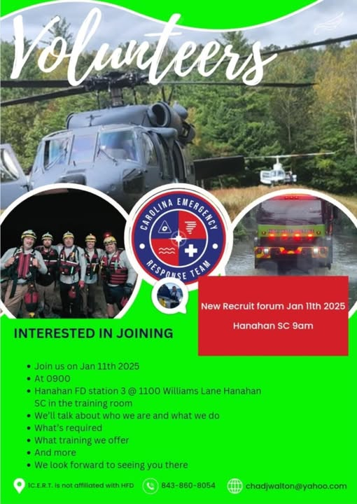 They can be found on Social Media platforms: Facebook (Carolina Emergency Response Team) and Instagram, Carolinacert, or you can visit them on their website at Carolinacert.com.
