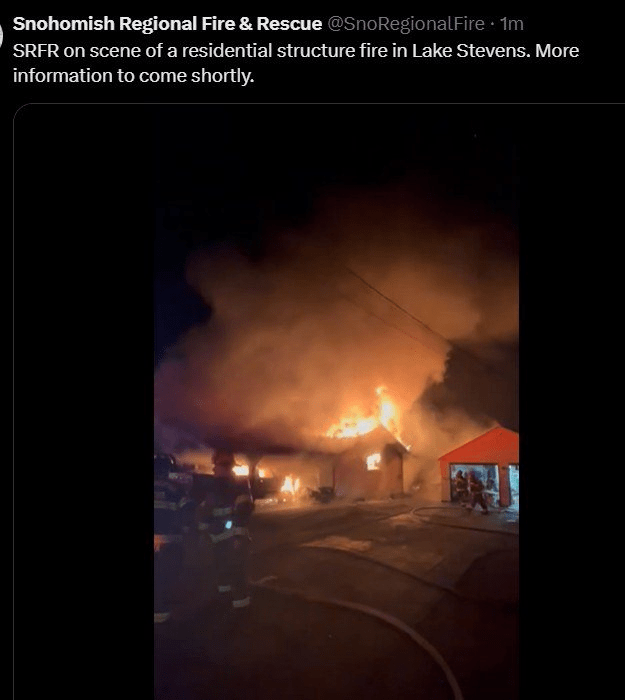 A late-night garage has broken out in the 2100 block of 71st Avenue Southeast in Lake Stevens, Washington, and appears to have started around 2015 hours PT has now extended into the main house.
