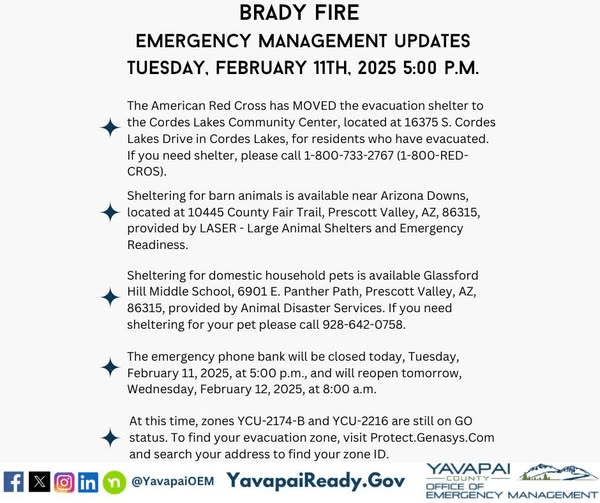 Late this morning just before noon PST, the Evacuation Shelter staffed by the American Red Cross volunteers was relocated to the Cordes Lakes Community Center, located at 16357 South Cordes Lakes Drive in Cordes Lakes, Arizona.