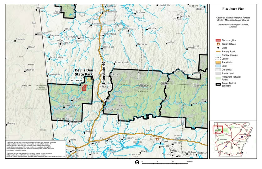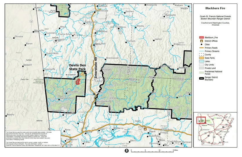 The Blackburn Fire is burning in the Ozark-St. Francis National Forest managed by the U.S. Forest Service, is about two miles northwest of Chester and two miles southwest of Devil’s Den State Park in Washington County, Arkansas.