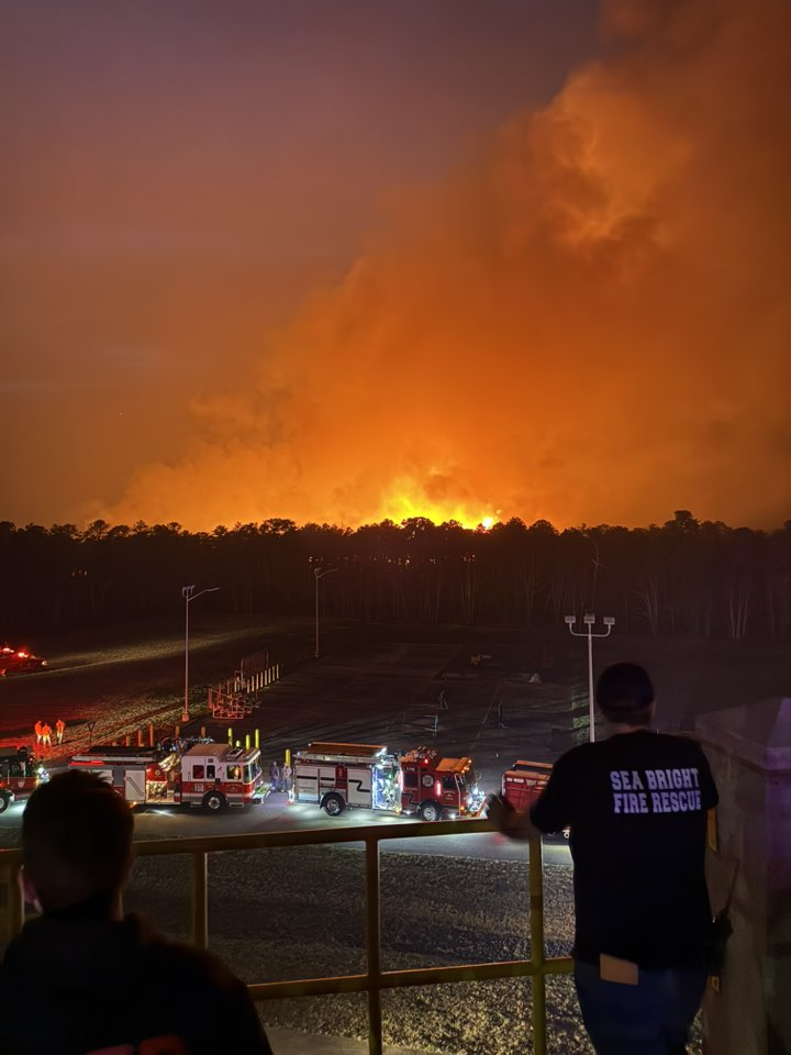 New Jersey Forest Fire Service: Multiple fire engines, bulldozers, and ground crews operating.