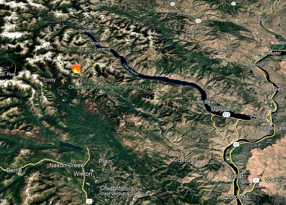 “Firefighting planes took on water in the Stehekin and the Rainbow Falls areas, where the [Pomas Fire] is located to the south.” – 6/16/2025, 1409 hours PT (Hiker)