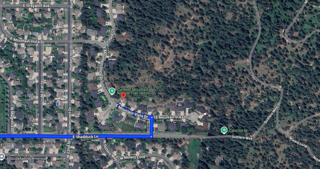 The area is a 24-acre open space park located in the 2300 block of East Mountaqin Vista Drive in CDA, IDA. It has a hiking and mountain biking trail system, with the trail being 1.5 miles in length and is rated intermediate in difficulty, with a few advanced areas. This is a city-owned area inside the CDA, Idaho boundaries.