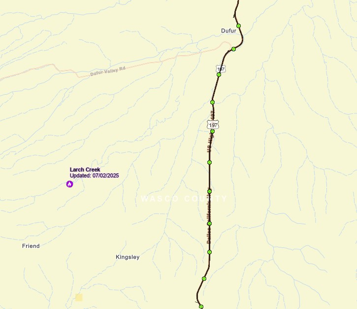 The LARCH CREEK FIRE is burning on Winslow Road, south of Dufur, near Friend (Wasco County), Oregon, which started on private lands this afternoon at 1545 hours.