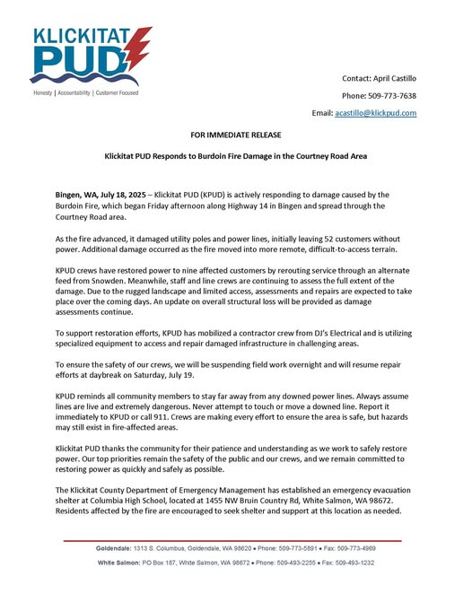 KLICKITAT PUD: On Friday, the utilities company released a statement that they responded to damage caused by the fire in the Courtney Road area. Power was restored to parts of the area through an alternate feed, and they were working to mitigate the more rural areas, which may take a little longer. The conditions were reported as the terrain is rugged, and there is limited access. They state that an assessment on structural loss will be updated as assessments are completed. PLEASE STAY AWAY FROM DOWNED POWER LINES. ALWAYS ASSUME THEY ARE ALIVE. Call KPUD or 911.