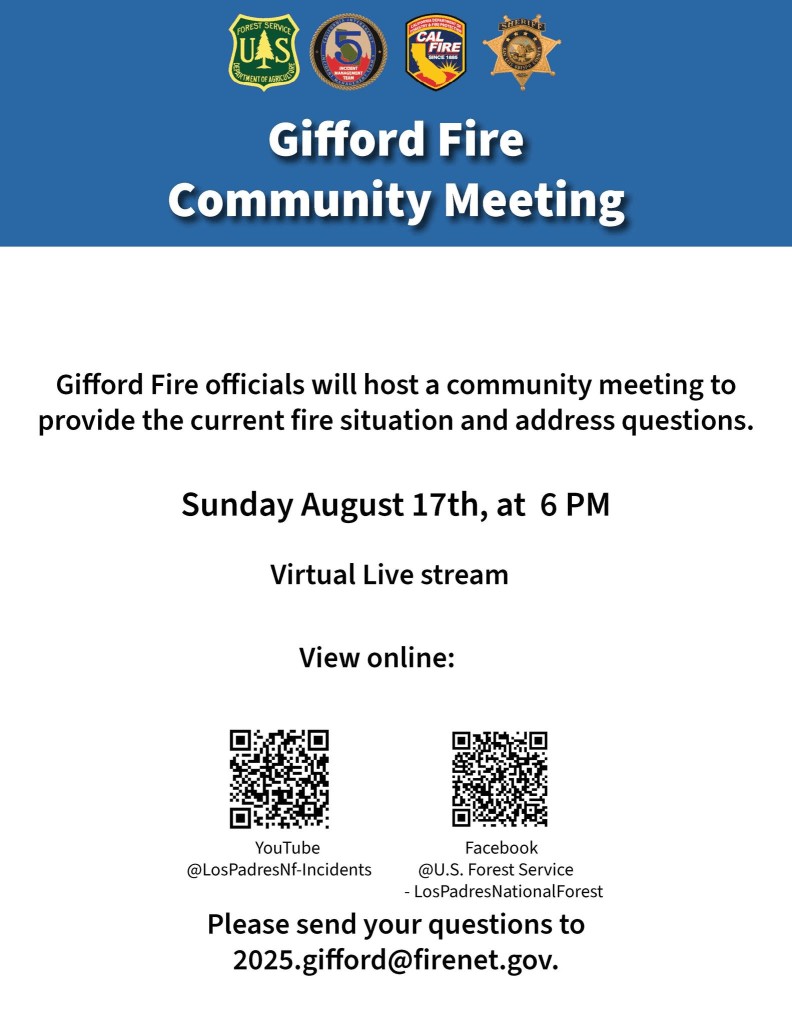 Pertinent evacuation information, road closures, and other important updates can be found on the CAL FIRE website https://www.fire.ca.gov/incidents/2025/8/1/gifford-fire.